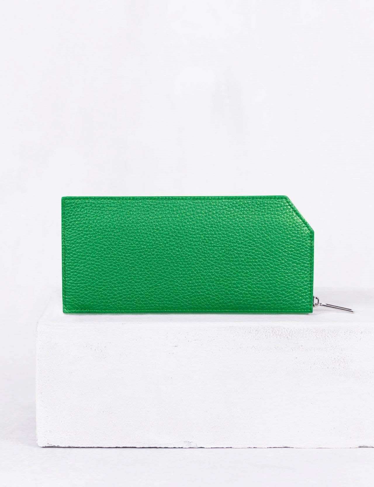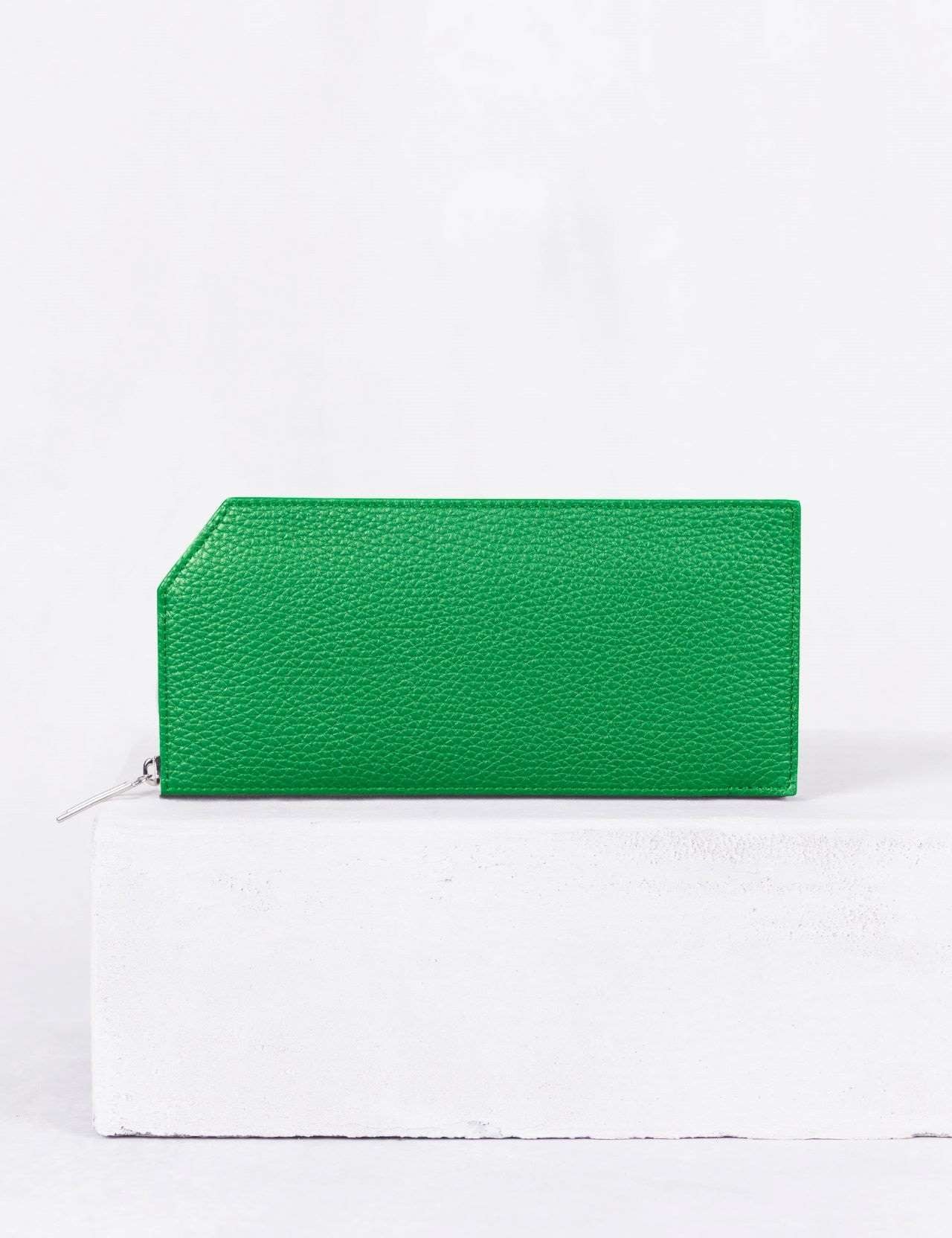 斜めカットが入るデザインのアイコニックなジップウォレット。
