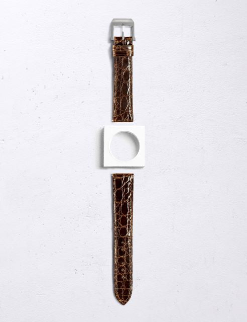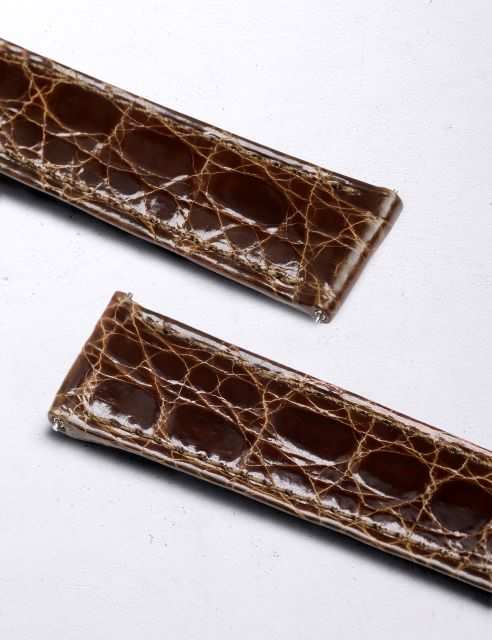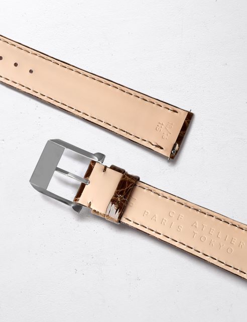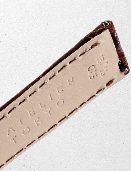ヴィンテージ、アンティークの時計にマッチするこだわりの時計ベルト。 ケースがよりよく引き立つよう厚みは薄め。 美しいカイマンが横から見ても際立つよう、 側面も表素材で覆う上品で贅沢な仕様「へり返し」の時計ベルト。 ステッチは表裏どちらも同じカラーで裏材のベージュとのコントラストがポイント。 裏材はなめらかでさらりとした肌触りによる快適な付け心地が魅力的。 カーフ(仔牛革)に耐汗加工を施した「デラックス」を使用。 製作はATELIER TOKYOの職人。 フランスの職人と同じ技術力に繊細さを兼ね備えた職人が、 ひとつひとつ、丹精を込め製作。 取付部ストレ-トの時計に対応。 時計ベルトはワンタッチで時計に取り付けできるバネ棒「アビエ®」を装着。 バネ棒に小さなツメが付いており、工具を使わずにベルト交換が可能。 オンラインストアセレクション