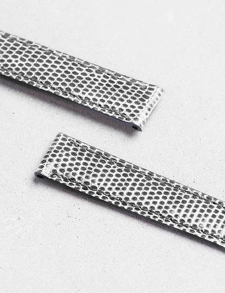 取付部ストレ-トの時計に対応。細かな紋様と華やかな発色が特徴のトカゲ革。