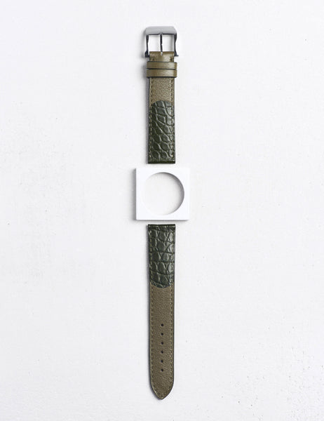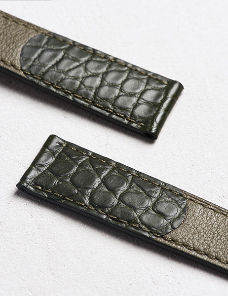 ラウンドDUOの時計ベルト。 ヴォ-リスとアリゲ-タ- マット丸斑・オリーブ。 取付部ストレ-トの時計に対応。絹のようなカーフと美しい紋様丸斑のコンビネーション。 裏材は通気性・吸湿性に優れたカーフ素材(ルカ)を使用。 時計ベルトはワンタッチで時計に取り付けできるバネ棒「アビエ®」を装着。 バネ棒に小さなツメが付いており、工具を使わずにベルト交換可能。