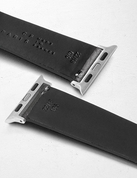 アップルウォッチストラップに日本限定素材「トリヨン」登場! ビジネス、カジュアルなど様々なシーンをワンランクアップさせるアップルウォッチ用ストラップ。 ワンタッチで時計に取り付けできる小さなツメ付きのバネ棒「アビエ®」を装着。 胴元幅22mmのカミーユ・フォルネの時計ベルトの付け替えも可能。 「トリヨン」は牛革の表面にシボ加工を施した柔らかく、傷がつきにくい耐久性の高い素材です。 裏には牛革にラバーコーティングした「カウチュ」アンチスウェットを採用。 汗が気になる季節はもちろん、通年でのご使用もおすすめ。 裏からの汗の浸透を防ぎベルトの傷みを軽減させるよう、表に縫い目を出さないひと工夫も。