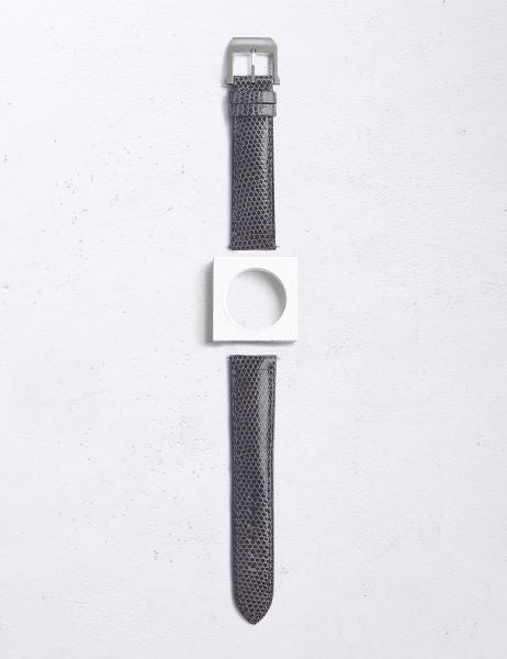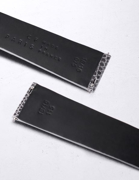 リザ-ド シャイニーの時計ベルト。 取付部ストレ-トの時計に対応。 細かな紋様と華やかな発色が特徴のトカゲ革。 裏には牛革にラバーコーティングした「アンチ・スウェット」モデルを採用。 汗が気になる季節はもちろん、通年でのご使用もおすすめ。 裏からの汗の浸透を防ぎベルトの傷みを軽減させるよう、表に縫い目を出さないひと工夫も。 時計への装着は小さな爪付きのバネ棒「アビエ®」をスライドさせてワンタッチで。 工具を使わずベルトの付け替えが可能。