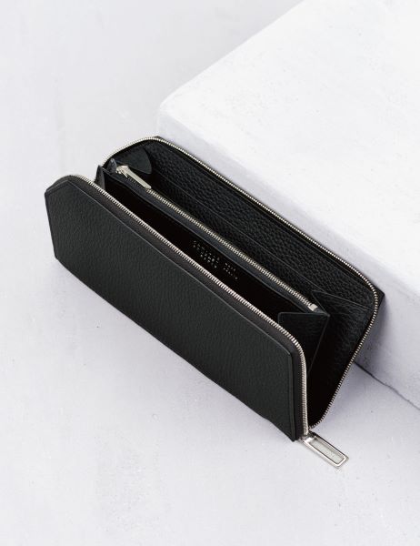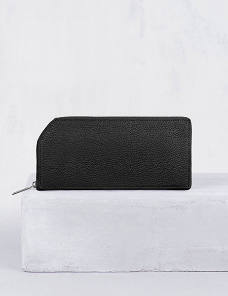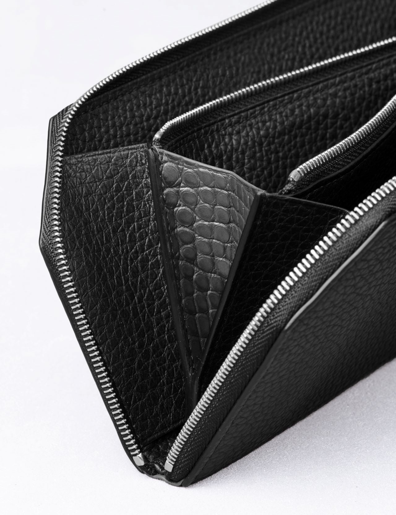 斜めカットが入るデザインのアイコニックなジップウォレット。