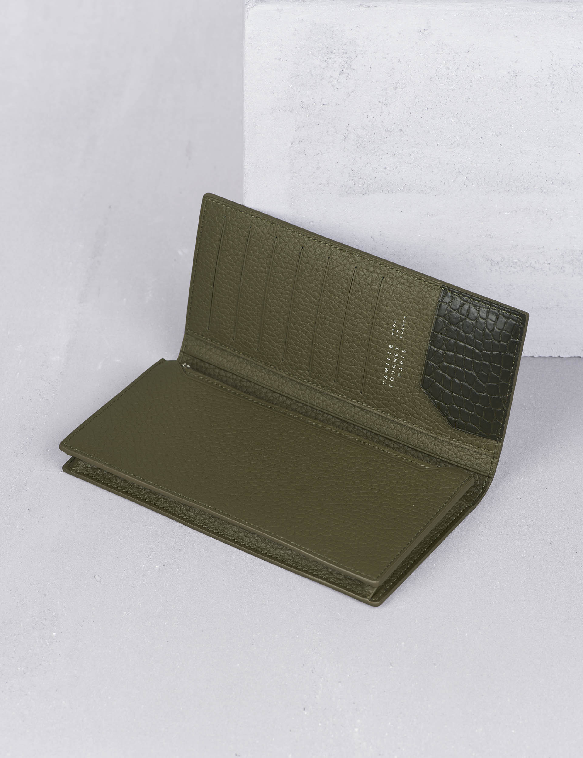 コインケース付き長財布のロングセラーモデル。 収納力も抜群で紙幣がストレスなく出し入れできるサイズ感と 実用的なコインケースを備えながらもスマートな印象。 カード段はカードの重なりを考えられ配置されているため、綺麗に収納可能。 素材はカーフに型押しを施したハリのあるヴォーグレネを使用。 型崩れやキズも⽬⽴ちにくく、⼿にしっくりと馴染むレザー。 <カミーユ・フォルネを代表する「VERSO(ヴェルソ)シリーズ」> 牛革と厳選されたアリゲーターのコンビネーションが魅力的。 開いた時にさりげなく見えるアリゲーターは宝石のように美しく輝き、 フランスのエスプリ漂う逸品。