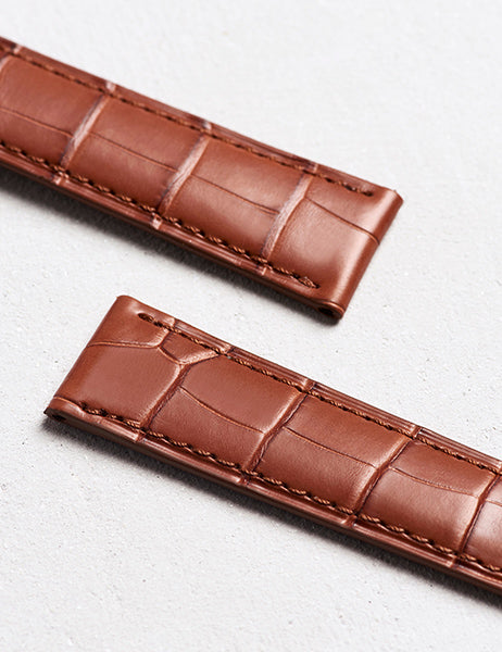 ミシシッピ・アリゲ-タ- マット竹斑の時計ベルト。 取付部ストレ-トの時計に対応。本体と同色のステッチ。 1頭の仔ワニから3~7本しか作ることが出来ない希少性の高い素材。 裏材は通気性・吸湿性に優れたカーフ素材(ベージュ)を使用。 時計ベルトはワンタッチで時計に取り付けできるバネ棒「アビエ®」を装着。 バネ棒に小さなツメが付いており、工具を使わずにベルト交換が可能。 ※写真はイメージです。バックルは付属品ではありませんので、Dバックル/バックルのページにて別途お求めください。