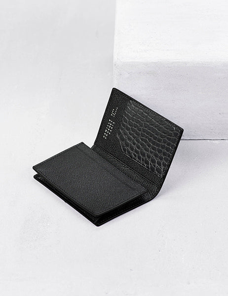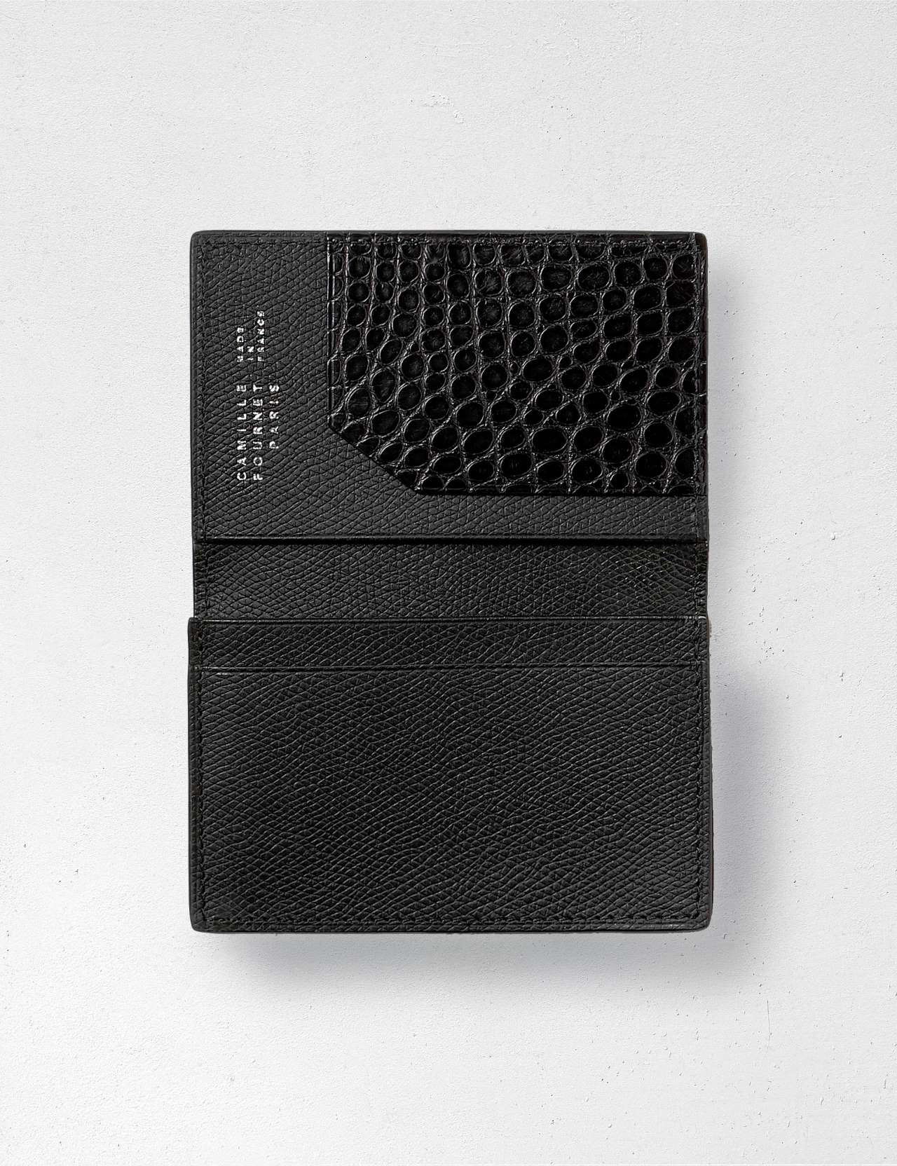 洗練されたシンプルなデザインの名刺入れ。 素材はカーフに型押しを施したハリのあるヴォーグレネを使用。 型崩れやキズも⽬⽴ちにくく、⼿にしっくりと馴染むレザー。 <カミーユ・フォルネを代表する「VERSO(ヴェルソ)シリーズ」> 牛革と厳選されたアリゲーターのコンビネーションが魅力的。 開いた時にさりげなく見えるアリゲーターは宝石のように美しく輝き、 フランスのエスプリ漂う逸品。
